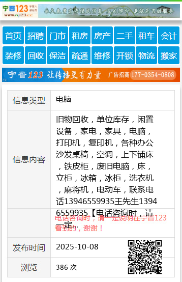 旧物回收,单位库存,闲置设备,家电,家具,电脑,打印机,复印机,各种办公沙发桌椅,空调,上下铺床,铁皮柜,废旧电脑,床,立柜,冰箱,冰柜,洗衣机,麻将机,电动车,联系电话13946559935王先生13946559935 【电话咨询时,请一定说明在七台河信息网看到的,谢谢!】 |