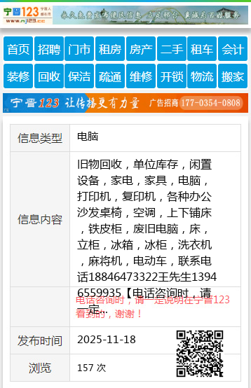 旧物回收,单位库存,闲置设备,家电,家具,电脑,打印机,复印机,各种办公沙发桌椅,空调,上下铺床,铁皮柜,废旧电脑,床,立柜,冰箱,冰柜,洗衣机,麻将机,电动车,联系电话18846473322王先生13946559935 【电话咨询时,请一定说明在七台河信息网看到的,谢谢!】 |
