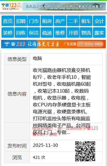 收光猫路由器机顶盒交换机8/斤,收老年手机10,智能机对型号,收电脑机箱60起,收笔记本110起,收数码相机,收显示器,收电视,收CPU内存条硬盘显卡主板电源光驱,收硬盘录像机、打印机监控头等所有电脑监控网络类电子产品。台河四区可上门。专做价好,量大可溢价!电脑组装、升级、维修、做系统;安装监控、维修监控。批发零售各种配置电脑、笔记本、显示器及配件。设备安装调试、厂家技术支持、门店及仓储服务。店铺地址:北岸2号大道7号楼18-19商服陈经理13199232912 【电话咨询时,请一定说明在七台河信息网看到的,谢谢!】 |