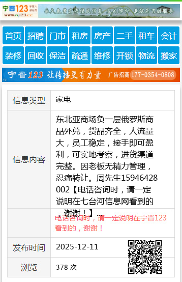 东北亚商场负一层俄罗斯商品外兑,货品齐全,人流量大,员工稳定,接手即可盈利,可实地考察,进货渠道完整。因老板无精力管理,忍痛转让。周先生15946428002 【电话咨询时,请一定说明在七台河信息网看到的,谢谢!】 |