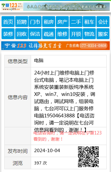 24小时上门维修电脑上门修台式电脑,笔记本电脑上门系统安装重装新版纯净系统XP、win7、win10安装,调试路由,调试网络,组装电脑,七台河可以上门服务修电脑19504643888 【电话咨询时,请一定说明在七台河信息网看到的,谢谢!】 |