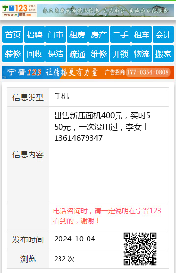 出售新压面机400元,买时550元,一次没用过,李女士13614679347