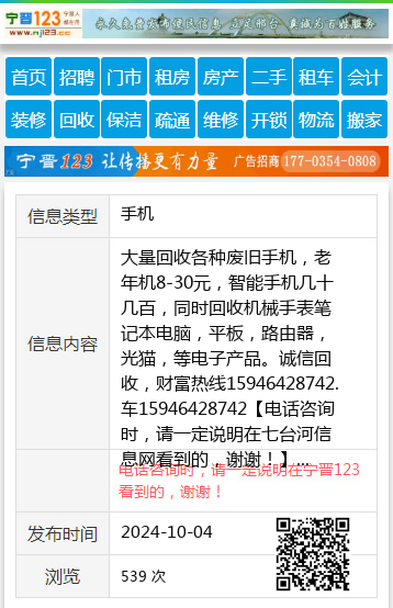 大量回收各种废旧手机,老年机8-30元,智能手机几十几百,同时回收机械手表笔记本电脑,平板,路由器,光猫,等电子产品。诚信回收,财富热线15946428742.车15946428742 【电话咨询时,请一定说明在七台河信息网看到的,谢谢!】 |