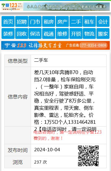 差几天10年奔腾B70,自动挡2.0排量,检车保险刚交完,(一整年)家庭自用,车况相当好,驾驶感舒适、平稳,安全行驶了8万多公里,真实里程表,带天窗、倒车影像、雷达,轮胎齐全。价格:1万5个人13314642812 【电话咨询时,请一定说明在七台河信息网看到的,谢谢!】 |