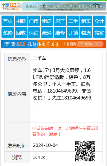 卖车17年3月大众蔚领,1.6L自动挡舒适版,棕色,8万多公里,个人一手车。联系电话:18104649699。非诚勿扰!丁先生18104649699 【电话咨询时,请一定说明在七台河信息网看到的,谢谢!】 |