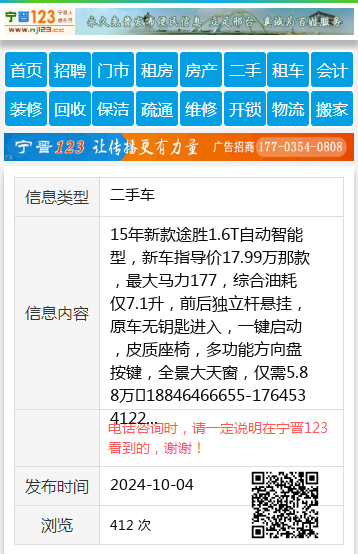 15年新款途胜1.6T自动智能型,新车指导价17.99万那款,最大马力177,综合油耗仅7.1升,前后独立杆悬挂,原车无钥匙进入,一键启动,皮质座椅,多功能方向盘按键,全景大天窗,仅需5.88万☎18846466655-17645341222王先生18846466655 【电话咨询时,请一定说明在七台河信息网看到的,谢谢!】 |