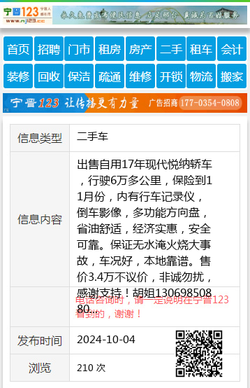 出售自用17年现代悦纳轿车,行驶6万多公里,保险到11月份,内有行车记录仪,倒车影像,多功能方向盘,省油舒适,经济实惠,安全可靠。保证无水淹火烧大事故,车况好,本地靠谱。售价3.4万不议价,非诚勿扰,感谢支持!胡姐13069850880 【电话咨询时,请一定说明在七台河信息网看到的,谢谢!】 |