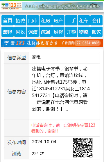出售电子琴书,钢琴书,老年机,台灯,音响连接线,地址北岸新城175号楼,电话18145412731吴女士18145412731 【电话咨询时,请一定说明在七台河信息网看到的,谢谢!】 |