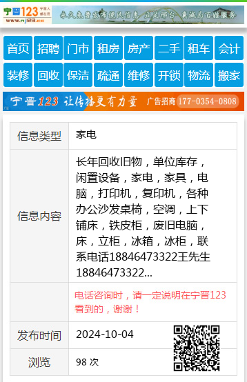 长年回收旧物,单位库存,闲置设备,家电,家具,电脑,打印机,复印机,各种办公沙发桌椅,空调,上下铺床,铁皮柜,废旧电脑,床,立柜,冰箱,冰柜,联系电话18846473322王先生18846473322 【电话咨询时,请一定说明在七台河信息网看到的,谢谢!】 |