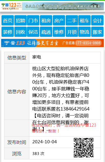 桃山区大型轮胎机油保养店外兑,现有稳定轮胎客户800台车,机油保养稳定客户400台车,接手就赚钱一年稳赚20万,地方大位置好,可增加更多项目,有意者提前电话联系匿名13846429164 【电话咨询时,请一定说明在七台河信息网看到的,谢谢!】 |