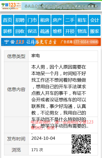 本人男,因个人原因需要在本地呆一个月,时间短不好找工作还不想闲着好吃懒做,想用自己的开车手法谋求点教人开车的事干,有证不会开或者没证想练车的可以联系我,事少好沟通,认真教,不论男女,我用自己的车手动挡不是什么特别好的车,想学习手动挡有需要的可以联系我,电话微信同号。朱先生15145648070 【电话咨询时,请一定说明在七台河信息网看到的,谢谢!】 |