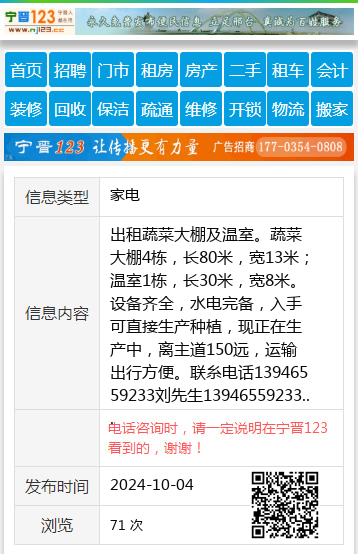 出租蔬菜大棚及温室。蔬菜大棚4栋,长80米,宽13米;温室1栋,长30米,宽8米。设备齐全,水电完备,入手可直接生产种植,现正在生产中,离主道150远,运输出行方便。联糸电话13946559233刘先生13946559233 【电话咨询时,请一定说明在七台河信息网看到的,谢谢!】 |