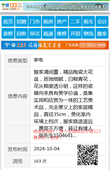 搬家清闲置,精品陶瓷大花盆,质地细腻,白釉青花,花从釉里透分明,这样的瓷器向来具有美学价值,是集实用和欣赏为一体的工艺美术品,完全意义上的家居精品,直径35cm,美化室内环境上档次,搬家路途遥远,携带不方便,转让有缘人,张先生15046419101 【电话咨询时,请一定说明在七台河信息网看到的,谢谢!】 |