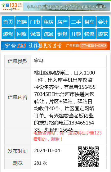 桃山区驿站转让,日入1100+件,出入库手机出库仪监控设备齐全,有意者15645570345七台河市快递片区转让,片区+驿站,驿站日均收件40个,片区固定网络订单。有兴趣想当老板创业的拨打招商电话13946516433。刘经理15645570345 【电话咨询时,请一定说明在七台河信息网看到的,谢谢!】 |