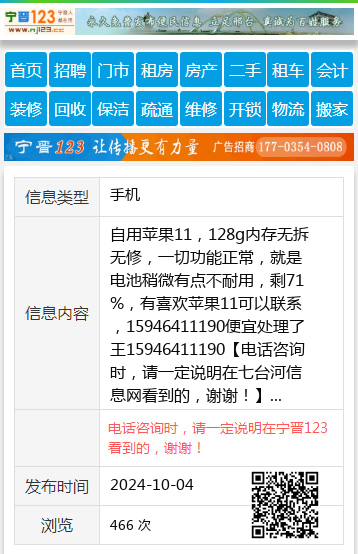 自用苹果11,128g内存无拆无修,一切功能正常,就是电池稍微有点不耐用,剩71%,有喜欢苹果11可以联系,15946411190便宜处理了王15946411190 【电话咨询时,请一定说明在七台河信息网看到的,谢谢!】 |