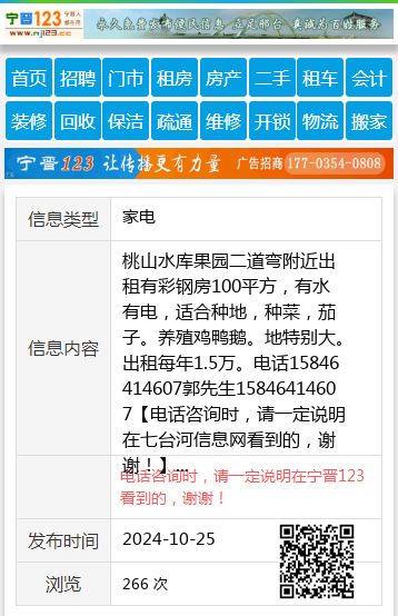 桃山水库果园二道弯附近出租有彩钢房100平方,有水有电,适合种地,种菜,茄子。养殖鸡鸭鹅。地特别大。出租每年1.5万。电话15846414607郭先生15846414607 【电话咨询时,请一定说明在七台河信息网看到的,谢谢!】 |