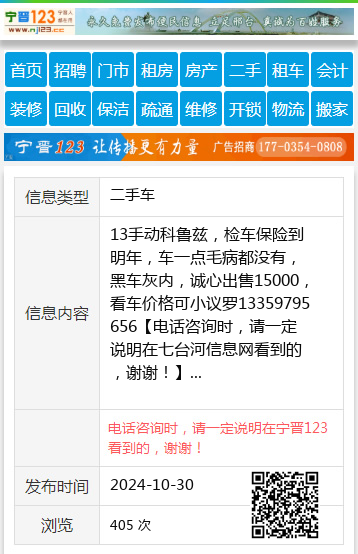 13手动科鲁兹,检车保险到明年,车一点毛病都没有,黑车灰内,诚心出售15000,看车价格可小议罗13359795656 【电话咨询时,请一定说明在七台河信息网看到的,谢谢!】 |