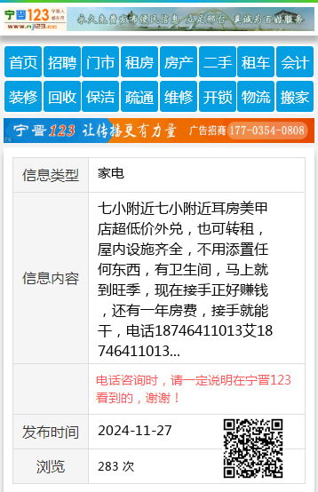 七小附近七小附近耳房美甲店超低价外兑,也可转租,屋内设施齐全,不用添置任何东西,有卫生间,马上就到旺季,现在接手正好赚钱,还有一年房费,接手就能干,电话18746411013艾18746411013 【电话咨询时,请一定说明在七台河信息网看到的,谢谢!】 |
