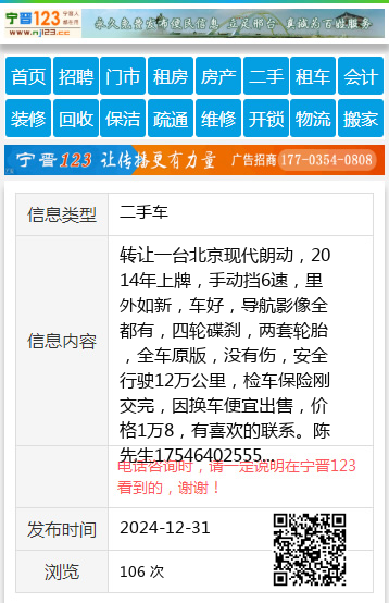转让一台北京现代朗动,2014年上牌,手动挡6速,里外如新,车好,导航影像全都有,四轮碟刹,两套轮胎,全车原版,没有伤,安全行驶12万公里,检车保险刚交完,因换车便宜出售,价格1万8,有喜欢的联系。陈先生17546402555 【电话咨询时,请一定说明在七台河信息网看到的,谢谢!】 |