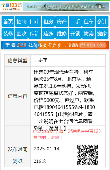 出售09年现代伊兰特,检车保险25年8月。北京底,精品车况.1.6手动挡。发动机变速箱底盘状态好,两套胎。价格9000元,包过户。联系电话18904641555先生18904641555 【电话咨询时,请一定说明在七台河信息网看到的,谢谢!】 |