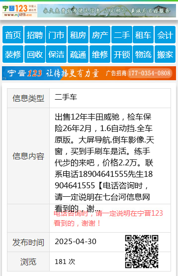 出售12年丰田威驰,检车保险26年2月,1.6自动挡.全车原版。大屏导航.倒车影像.天窗,买到手刷车是活。练手代步的来吧,价格2.2万。联系电话18904641555先生18904641555 【电话咨询时,请一定说明在七台河信息网看到的,谢谢!】 |