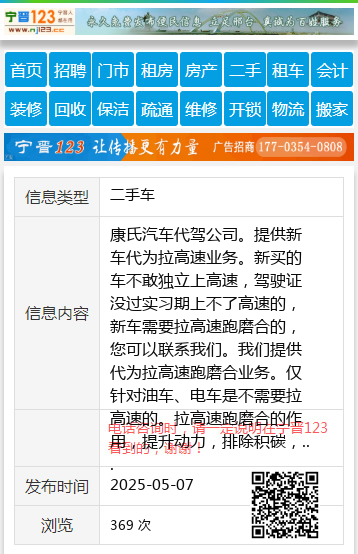 康氏汽车代驾公司。提供新车代为拉高速业务。新买的车不敢独立上高速,驾驶证没过实习期上不了高速的,新车需要拉高速跑磨合的,您可以联系我们。我们提供代为拉高速跑磨合业务。仅针对油车、电车是不需要拉高速的。拉高速跑磨合的作用,提升动力,排除积碳,降低油耗。新车磨合期标准:公里数大于4000的,没有做过首保的。收费标准为200元/一次每次大概用时2小时左右完成。新车公里数大于5000公里以上的,且做过首保的。收费保准为:收费标准为400元/一次每次大概用时4小时左右完成。专业的事请交给专业的人做。辛苦钱不议价!!预约电话:13069852223康先生13069852223 【电话咨询时,请一定说明在七台河信息网看到的,谢谢!】 |