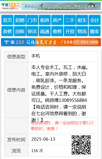 本人专业木工。瓦工,水暖。电工。室内外装修,刮大白,刷乳胶漆。一条龙服务。免费设计,价格和和理,保证质量。干人工费。大包都可以。姚师傅13089556884 【电话咨询时,请一定说明在七台河信息网看到的,谢谢!】 |