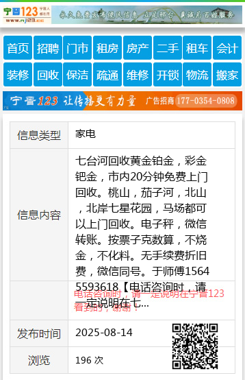 七台河回收黄金铂金,彩金钯金,市内20分钟免费上门回收。桃山,茄子河,北山,北岸七星花园,马场都可以上门回收。电子秤,微信转账。按票子克数算,不烧金,不化料。无手续费折旧费,微信同号。于师傅15645593618 【电话咨询时,请一定说明在七台河信息网看到的,谢谢!】 |