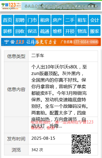 个人出10年沃尔沃s80L,至zun版最顶配。灰外黑内,全国黑内的你真不好找。保你丹拿音响,音响拆了单卖都能卖8千。今年3月刚做完保养。发动机变速箱底盘特别好。全车一个故障码没有。两套胎。配置太多了,四座座椅加热,方向盘调节,自动大灯,升降屏幕,原车遥控器。四门无钥匙进入。自动空调,大灯呲水,电动座椅,座椅记忆等等,全车就4件划痕补漆。全车一个螺丝都没动过。实表跑了16万公里。懂车的都知道沃尔沃的发动机抗造,正常保养再跑20万公里都没问题。保险明年3月,检车明年8月。诚心出18800,不议价,少一个钢镚不卖。联系电话19945958668童先生19945958668 【电话咨询时,请一定说明在七台河信息网看到的,谢谢!】 |