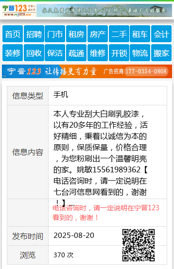 本人专业刮大白刷乳胶漆,以有20多年的工作经验,活好精细,秉着以诚信为本的原则,保质保量,价格合理,为您粉刷出一个温馨明亮的家。姚敏15561989362 【电话咨询时,请一定说明在七台河信息网看到的,谢谢!】 |