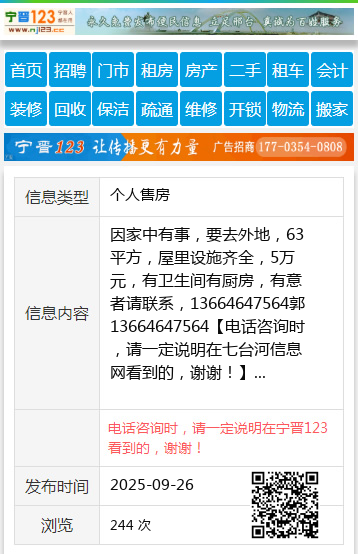 因家中有事,要去外地,63平方,屋里设施齐全,5万元,有卫生间有厨房,有意者请联系,13664647564郭13664647564 【电话咨询时,请一定说明在七台河信息网看到的,谢谢!】 |