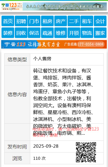 转让餐饮技术和设备,有汉堡、鸡排饭、烤肉拌饭、酱香饼、奶茶、果汁、冰淇淋、鸡蛋仔、章鱼小丸子等等,包教全部技术,出餐快,利润空间大。设备有澳柯玛保鲜柜、星星冷柜、西泠冷柜、冰淇淋机、小型制冰机、美的微波炉、方太电磁炉、美的电饭煲、电炸锅、煎锅、炒锅、消毒柜、筷子机、吧台(长2米、宽0.6米、高1.13米)、大小8张桌子和椅子、凳子。所需设备一应俱全。您找好地址即可开店。价格面议。有意者电话咨询,非诚勿扰。刘女士17713357193 【电话咨询时,请一定说明在七台河信息网看到的,谢谢!】 |