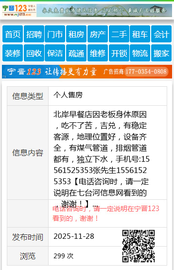 北岸早餐店因老板身体原因,吃不了苦,吉兑,有稳定客源,地理位置好,设备齐全,有煤气管道,排烟管道都有,独立下水,手机号:15561525353张先生15561525353 【电话咨询时,请一定说明在七台河信息网看到的,谢谢!】 |