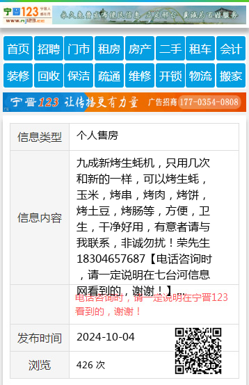 九成新烤生蚝机,只用几次和新的一样,可以烤生蚝,玉米,烤串,烤肉,烤饼,烤土豆,烤肠等,方便,卫生,干净好用,有意者请与我联系,非诚勿扰!荣先生18304657687 【电话咨询时,请一定说明在七台河信息网看到的,谢谢!】 |