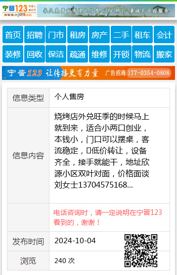 烧烤店外兑旺季的时候马上就到来,适合小两口创业,本钱小,门口可以摆桌,客流稳定,低价转让,设备齐全,接手就能干,地址欣源小区双叶对面,价格面谈刘女士13704575168 【电话咨询时,请一定说明在七台河信息网看到的,谢谢!】 |