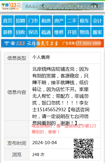北岸烧烤店旺铺吉兑;因为有别的发展,客源稳定,只赚不赔,接手就赚钱,低价转让,因为店忙不开。家里无人帮忙;带配方,非诚勿扰,饭口勿扰!!!!李女士15145652932 【电话咨询时,请一定说明在七台河信息网看到的,谢谢!】 |