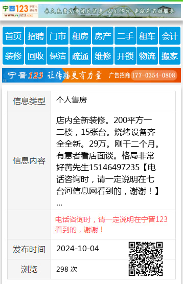 店内全新装修。200平方一二楼,15张台。烧烤设备齐全全新。29万。刚干二个月。有意者看店面谈。格局非常好黄先生15146497235 【电话咨询时,请一定说明在七台河信息网看到的,谢谢!】 |