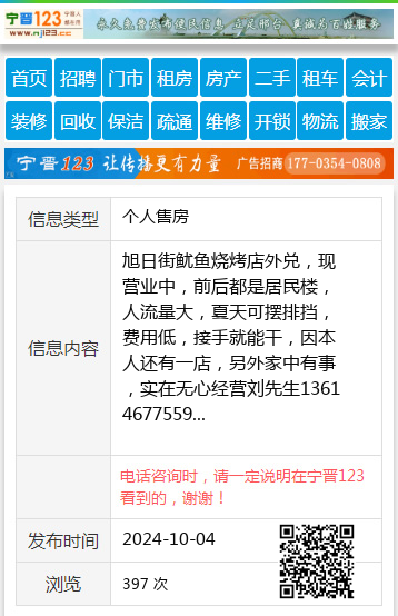 旭日街鱿鱼烧烤店外兑,现营业中,前后都是居民楼,人流量大,夏天可摆排挡,费用低,接手就能干,因本人还有一店,另外家中有事,实在无心经营刘先生13614677559 【电话咨询时,请一定说明在七台河信息网看到的,谢谢!】 |