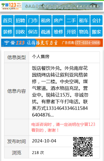 饭店餐饮外兑。外兑南岸花园烧烤店转让叙利亚风格装修,一二楼。中央空调。煤气管道。酒水物品充足。营业中。现转让15万。非诚勿扰。有意者下午打电话。联系方式13314643346115846404876 【电话咨询时,请一定说明在七台河信息网看到的,谢谢!】 |