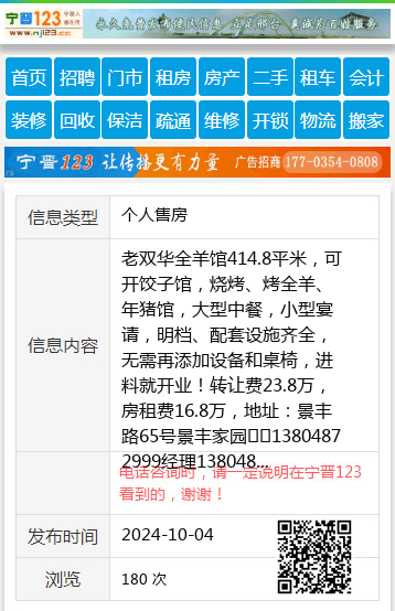 老双华全羊馆414.8平米,可开饺子馆,烧烤、烤全羊、年猪馆,大型中餐,小型宴请,明档、配套设施齐全,无需再添加设备和桌椅,进料就开业!转让费23.8万,房租费16.8万,地址:景丰路65号景丰家园☎️13804872999经理13804872999 【电话咨询时,请一定说明在七台河信息网看到的,谢谢!】 |