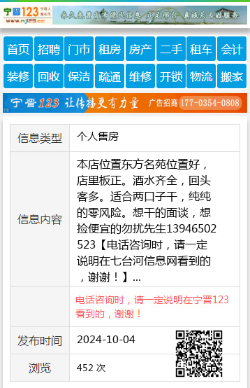 本店位置东方名苑位置好,店里板正。酒水齐全,回头客多。适合两口子干,纯纯的零风险。想干的面谈,想捡便宜的勿扰先生13946502523 【电话咨询时,请一定说明在七台河信息网看到的,谢谢!】 |