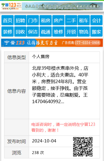 北岸39号楼水煮串外兑,店小利大,适合夫妻店。40平米,房费到24年8月。营业额稳定,接手挣钱。由于孩子需要陪读,忍痛割爱。王14704640992 【电话咨询时,请一定说明在七台河信息网看到的,谢谢!】 |