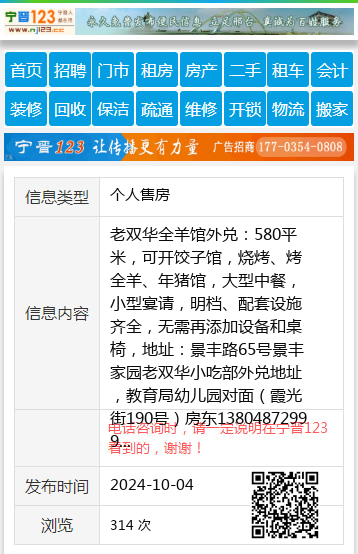 老双华全羊馆外兑:580平米,可开饺子馆,烧烤、烤全羊、年猪馆,大型中餐,小型宴请,明档、配套设施齐全,无需再添加设备和桌椅,地址:景丰路65号景丰家园老双华小吃部外兑地址,教育局幼儿园对面(霞光街190号)房东13804872999 【电话咨询时,请一定说明在七台河信息网看到的,谢谢!】 |