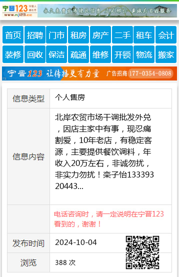 北岸农贸市场干调批发外兑,因店主家中有事,现忍痛割爱,10年老店,有稳定客源,主要提供餐饮调料,年收入20万左右,非诚勿扰,非实力勿扰!栾子怡13339320443 【电话咨询时,请一定说明在七台河信息网看到的,谢谢!】 |