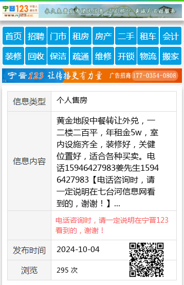 黄金地段中餐转让外兑,一二楼二百平,年租金5w,室内设施齐全,装修好,关健位置好,适合各种买卖。电话15946427983姜先生15946427983 【电话咨询时,请一定说明在七台河信息网看到的,谢谢!】 |