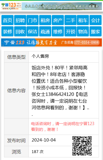 饭店外兑!80平!紧邻局高和四中!8年老店!客源稳位置优!适合各种小型餐饮!投资小成本低,回报快!张女士13846424120 【电话咨询时,请一定说明在七台河信息网看到的,谢谢!】 |
