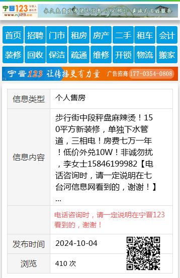 步行街中段秤盘麻辣烫!150平方新装修,单独下水管道,三相电!房费七万一年!低价外兑10W!非诚勿扰,李女士15846199982 【电话咨询时,请一定说明在七台河信息网看到的,谢谢!】 |