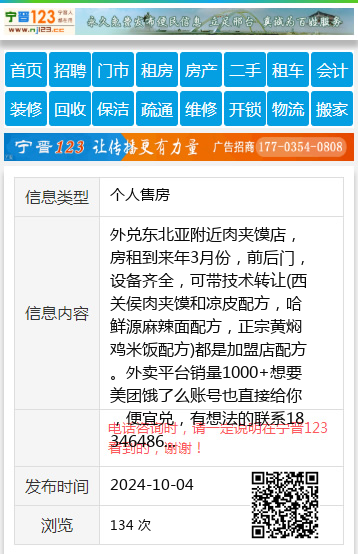 外兑东北亚附近肉夹馍店,房租到来年3月份,前后门,设备齐全,可带技术转让(西关侯肉夹馍和凉皮配方,哈鲜源麻辣面配方,正宗黄焖鸡米饭配方)都是加盟店配方。外卖平台销量1000+想要美团饿了么账号也直接给你,便宜兑,有想法的联系18346486511高先生18346486511 【电话咨询时,请一定说明在七台河信息网看到的,谢谢!】 |