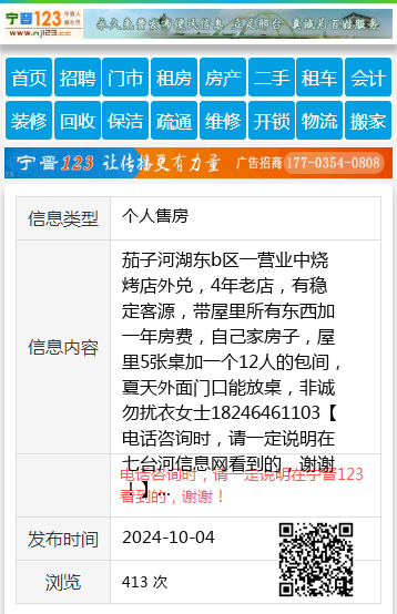 茄子河湖东b区一营业中烧烤店外兑,4年老店,有稳定客源,带屋里所有东西加一年房费,自己家房子,屋里5张桌加一个12人的包间,夏天外面门口能放桌,非诚勿扰衣女士18246461103 【电话咨询时,请一定说明在七台河信息网看到的,谢谢!】 |