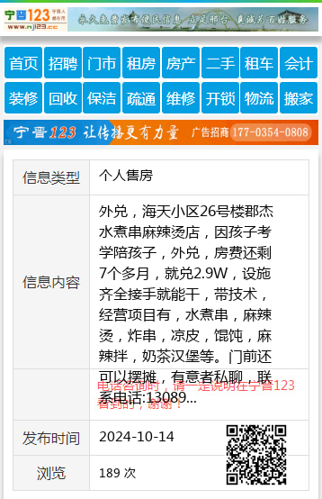 外兑,海天小区26号楼郡杰水煮串麻辣烫店,因孩子考学陪孩子,外兑,房费还剩7个多月,就兑2.9W,设施齐全接手就能干,带技术,经营项目有,水煮串,麻辣烫,炸串,凉皮,馄饨,麻辣拌,奶茶汉堡等。门前还可以摆摊,有意者私聊,联系电话:13089548677宋女士13089548677 【电话咨询时,请一定说明在七台河信息网看到的,谢谢!】 |